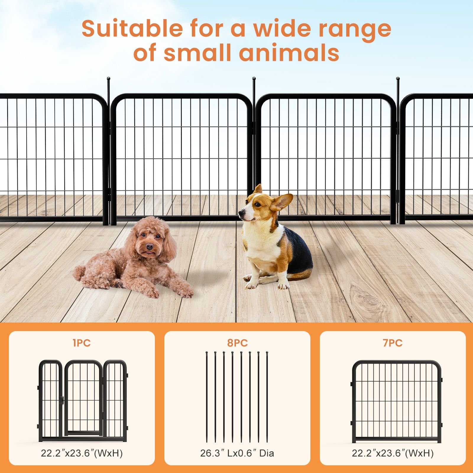 Suitable for all kinds of small animals: this dynamic and expandable pet pen is not limited to dogs and is suitable for small and medium-sized animals such as toy dogs dogs, corgis, rabbits, ducks, bunnies, and puppies. You can choose different fence sizes and quantity according to your pet's size. It can be used both indoor and outdoor.