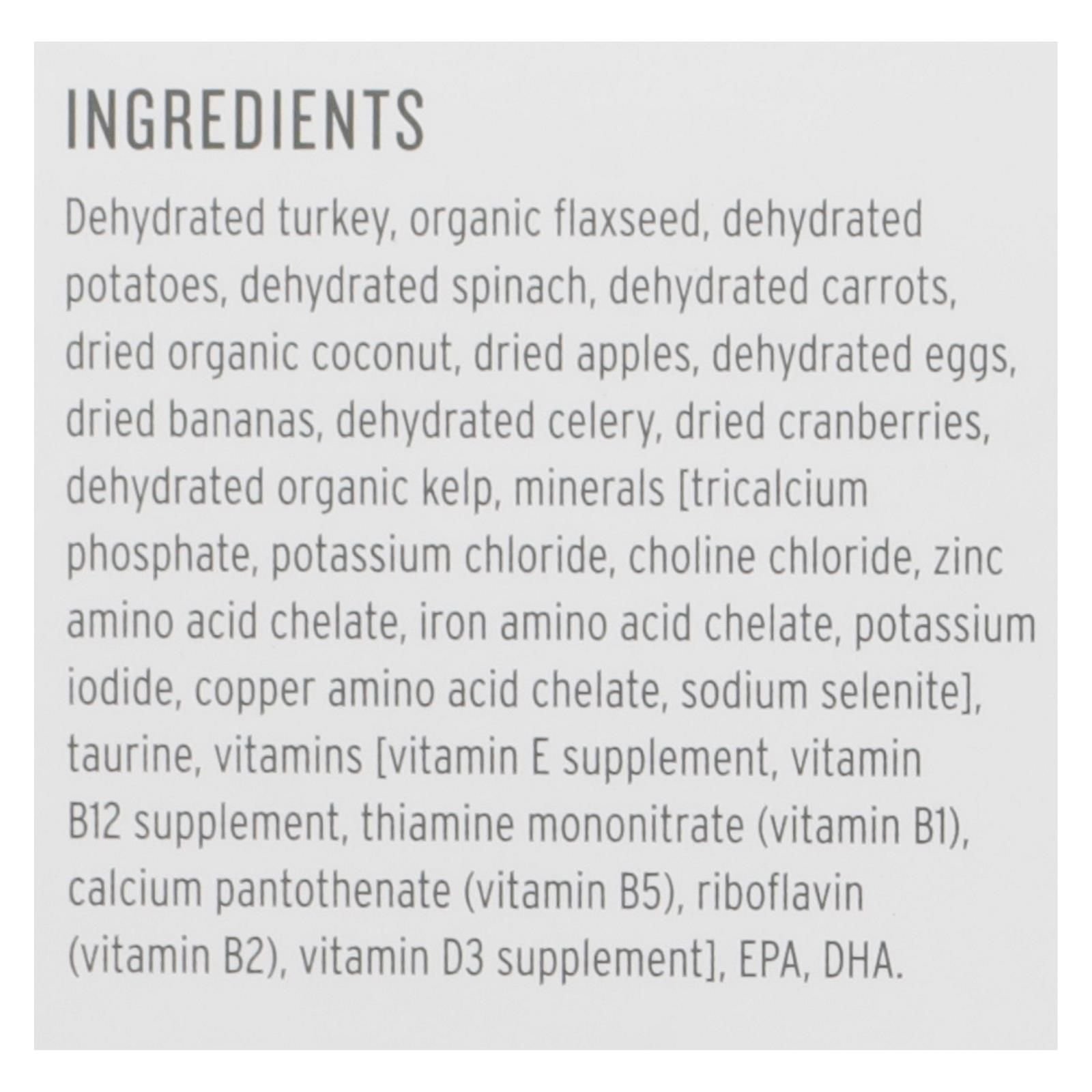 ingredients : dehydrated turkey;organic flaxseed;dehydrated potatoes;dehydrated spinach;dehydrated carrots;dried organic coconut;dried apples;dehydrated eggs;dried bananas;dehydrated celery;dried cranberries;dehydrated organic kelp;minerals [tricalcium phosphate, potassium chloride, choline chloride, zinc amino acid chelate, iron amino acid chelate, potassium iodide, copper amino acid chelate, sodium selenite];taurine;vitamins [vitamin e supplement, vitamin b12 supplement, thiamine mononitrate (vitamin b1), c